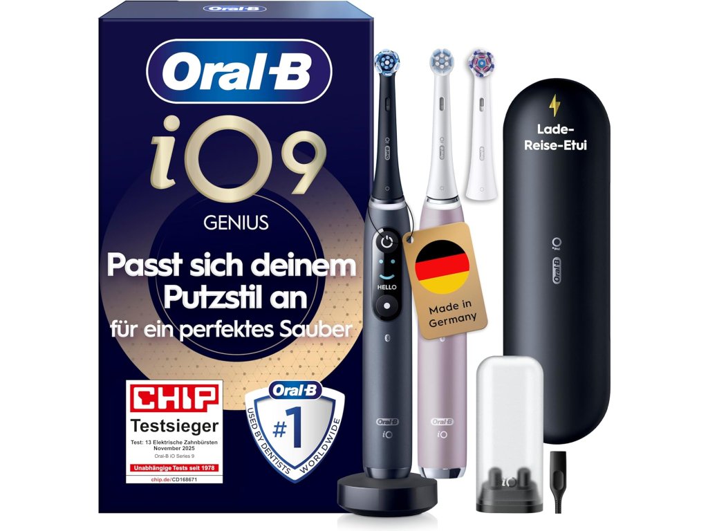 | Oral-B iO Series 9 Elektrische Zahnbürste, Doppelpack — Electric Toothbrush, Inkl, 3 Aufsteckbürsten, Lade-Reise-Etui, Schnellladestation — 7 Modi für Zahnpflege, Designed by Braun, Schwarz und Rosa | B0B5B7Q5X6 | 4210201449058 | 1 | 521,8 € | LPNHK479801099 |